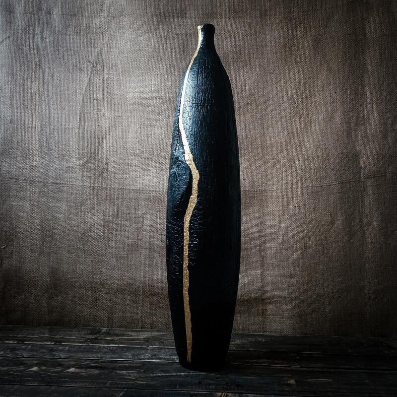 La composition irrégulière et charbonneuse du bois, résultat de la carbonisation, lui confère un aspect à la fois rustique et contemporain. C’est cette caractéristique que j’ai souhaité mettre en valeur dans mes créations.